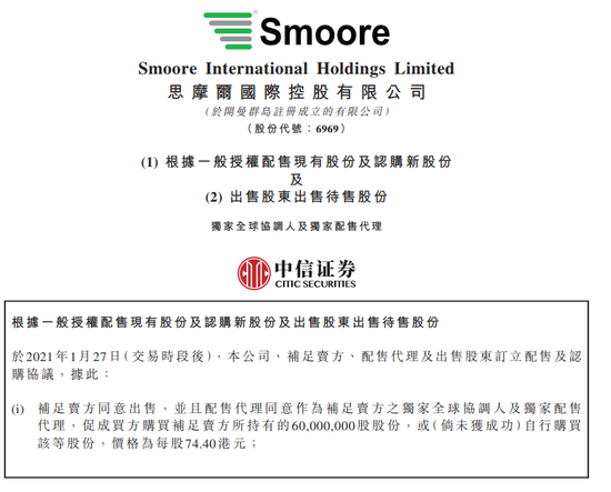 思摩尔国际(06969)公布,于2021年1月27日,该公司、补足卖方Aletech Holding Limited、配售代理中信里昂证券有限公司及出售股东Andy Xiong Holding Limited订立配售及认购协议,据此:
