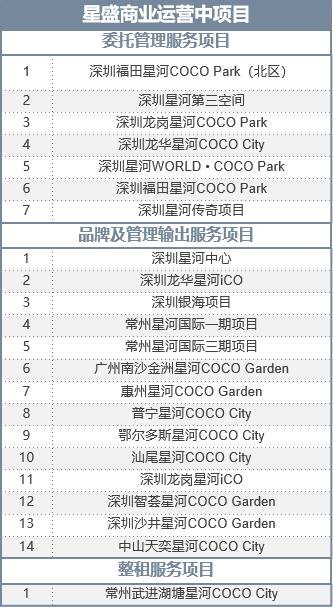截至去年9月,星盛商业所服务项目中,已开始运营且已贡献收入的项目共计22个,包括7个委托管理服务项目,以COCO Park为主;14个品牌及管理输出项目,以COCO City及COCO Garden系列为主;另有1个整租项目。