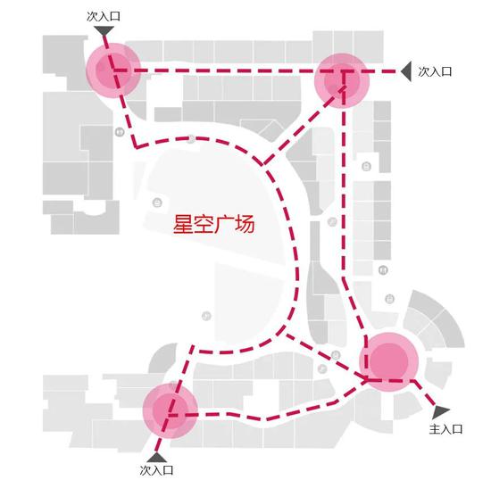 平面图上可看到,深圳福田星河COCO Park四角均为次中庭,各自配有主/次出入口,将客流从四面八方引来,叠加采光、通透性、导视性优势。