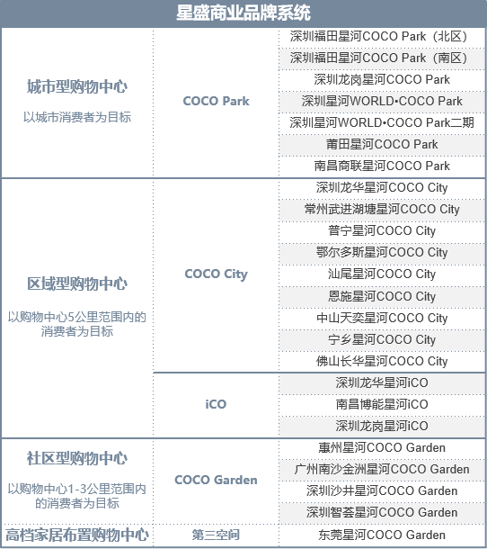 目前,星盛商业旗下有4个品牌产品线,城市型购物中心“COCO Park”、区域型购物中心“COCO City及iCO”、社区型购物中心“COCO Garden”及高档家居布置购物中心“第三空间”。