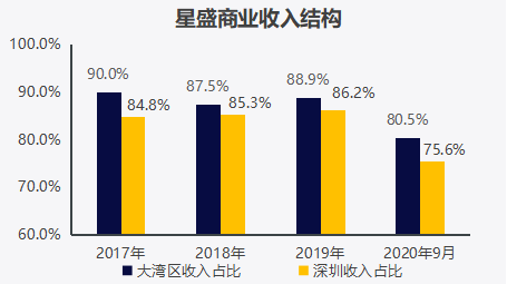 分区看,星盛商业在管的45个项目,有27个位于大湾区,对应的合约面积占比为44.4%。而来自持续经营业务的收入中,大湾区贡献近8成,单单深圳就达到75.6%。