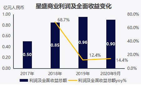 2020年前9个月,星盛商业收入3.06亿元,同比增长6.68%;毛利润1.69亿元,同比增长14.72%;净利润0.90亿元,同比增长14.37%。