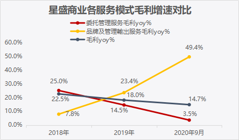 从增速看,品牌及管理输出服务表现强劲,至2020年9月,其收入占比由2017年的19.3%提升至23.9%,对应的毛利占比则由26.3%提升至32.0%。