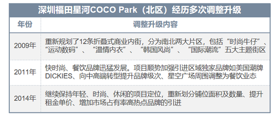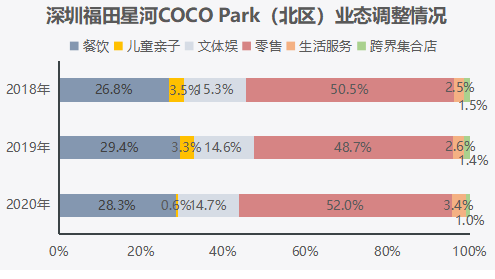 2017年起,深圳福田星河COCO Park进行了开业十多年来最大力度的业态升级调整。围绕星空广场设置轻餐氛围满足社交需求,内街设置高端零售获取高额收益。与此同时,加大零售业态占比,至2020年已过半。
