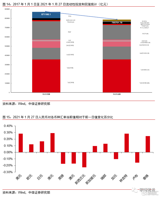 央行公告称,临近月末财政支出大幅增加, 2021年1月27日中国人民银行以利率招标方式开展了1800亿元逆回购操作,维护银行体系流动性合理充裕。当日有2800亿元7天逆回购到期,实现流动性净回笼1000亿元。