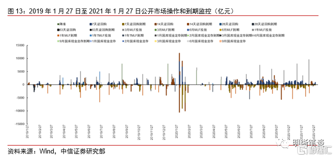 我们对市场流动性情况进行跟踪,观测2017年开年来至今流动性的“投与收”。增量方面,我们根据逆回购、SLF、MLF等央行公开市场操作、国库现金定存等规模计算总投放量;减量方面,我们根据2020年12月对比2016年12月M0累计增加16010.66亿元,外汇占款累计下降8117.16亿元、财政存款累计增加9868.66亿元,粗略估计通过居民取现、外占下降和税收流失的流动性,并考虑公开市场操作到期情况,计算每日流动性减少总量。同时,我们对公开市场操作到期情况进行监控。