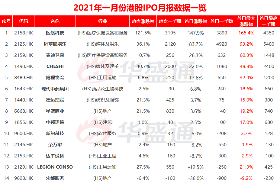 在2021年的1月份,港股共有14家公司挂牌上市,这14家公司总体来看首日上涨的有9家,首日上涨率为64.3%表现不俗。