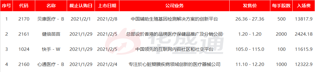 与快手同时期招股的其他几家公司也实力不可小觑,包括专注于心脏瓣膜疾病领域创新的心通医疗-B、有着中国“生殖辅助基因检测第一股”之称的贝康医疗-B都将在2月初挂牌上市。