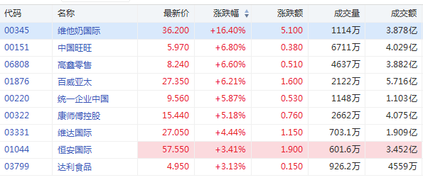 必需消费品集体走高,其中,维他奶国际大涨16%,中国旺旺、高鑫零售、百威亚太涨6%,康师傅、统一企业中国涨6%,维达国际、恒安国际涨4%。