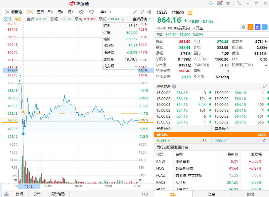 财报发布后,特斯拉盘后股价大跌,一度跌超6%,最后收跌5.02%。今日盘前截止19:57,特斯拉跌5.22%。