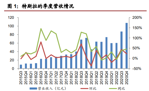 2020Q4 特斯拉实现营收107.44 亿美元,同环比分别增长 45.50%/23.34%,主要是汽车交付量大幅增长以及储能等其他业务的增长。