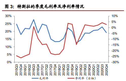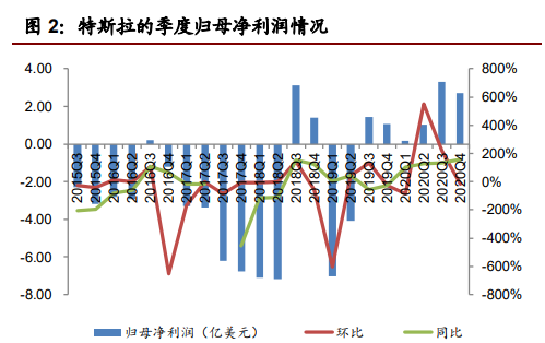 2020Q4 特斯拉归母净利润 3.31 亿美元,连续第六个季度盈利,同比增长157.14%但环比下滑 18.43%,主要受到毛利率下滑影响。