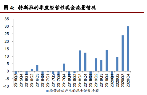 2020Q4 经营性现金流量净额为 30.19 亿美元,再创历史新高,同环比分别增长 111.86%/25.79%,使得 Q4 自由现金流达 18.68亿 美 元 ; 2020Q4 资 本 支 出 为 11.51 亿 美 元 , 同环比分别增长179.37%/14.53%,主要是投资于弗里蒙特工厂的产能扩张以及上海、柏林、德克萨斯工厂的建设,而随着几大工厂投建的持续推进,特斯拉的资本开支将会继续增加,不过从当前的现金流情况看,能够满足产能扩张的需要。