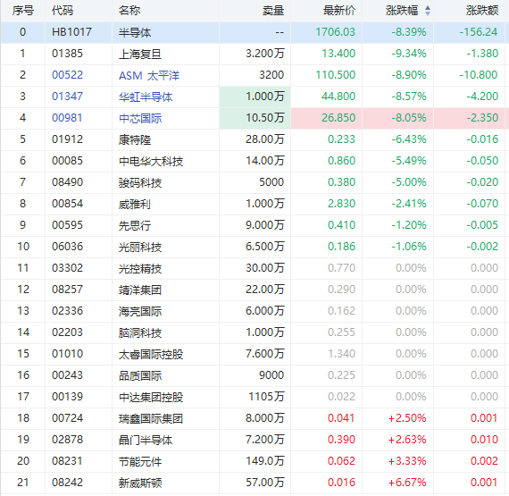 华盛资讯1月28日消息,半导体行业不再维持高度景气。本周板块严重下挫,今日各成分股持续下跌。截至发稿,上海复旦已跌超9%,ASM太平洋、华虹半导体、中芯国际皆跌超8%。