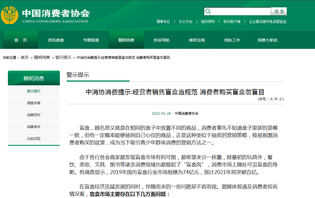 针对时下流行的盲盒产品,中消协日前发文提示,有经营者用盲盒“清库存”,损害消费者合法权益,扰乱市场,提醒广大消费者勿盲目购买。
