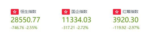 截至1月28日收盘,恒指重挫2.55%,报28550.77点,恒生科技指数暴跌4.43%,报9372.88点。