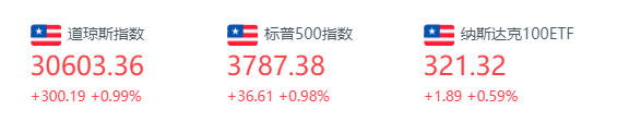 周四道指收盘上涨300.19点,或0.99%,报30603.36点;纳指涨66.56点,或0.50%,报13337.16点;标普500指数涨36.61点,或0.98%,报3787.38点。