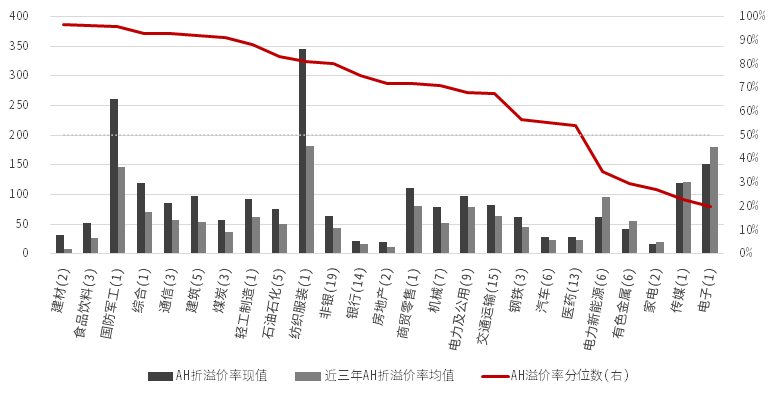 资料来源:Wind,中信证券投资顾问部;各行业括号内数字代表该行业AH两地上市公司数。部分行业AH公司较少,存在代表性较弱的额问题。多家AH上市公司的溢价率及分位数采取行业流通市值加权;数据截至2021年1月22日。