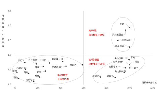 电子、计算机等科技板块虽然港股相对A股有溢价、行业估值总体也比A股便宜,但溢价率中位数处于低位,行业估值自身的分位数处于高位,说明板块本身并不便宜。