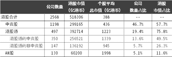 其中,中资股(含H股、红筹股、中资民营股)在港股市场的市值占比达到57.7%,占据了港股市场的半壁江山。港股通目前覆盖479支个股,虽然个数不到20%,但个股平均总市值达到1223亿港币,且以龙头公司居多,占港股市值比重达到75.8%。