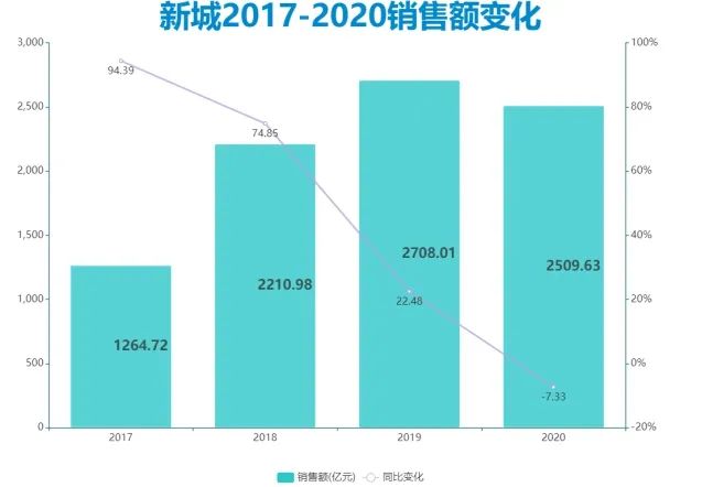 对比2019年,即便经历了至暗时刻,新城仍交出2708亿元销售成绩单,同比增加32.5%,其中住宅销售占比71%,综合体销售占比29%。