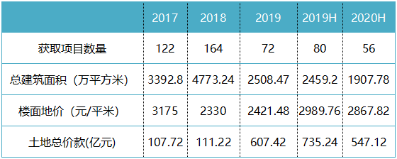 据公告披露,新城上半年新增土地储备56幅,总建筑面积1907.78万平方米,平均楼面地价为2867.82元/平方米。可见,无论是项目数量还是新增建筑面积都是近年低位,但均价相较2019年全年却上升了不少。