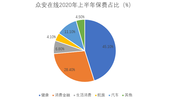 截至2020年上半年,众安在线在健康、消费金融、生活消费、航旅、汽车五大生态的保费占比分别为:45.1%、28.4%、6.8%、4.1%、11.1%。而2019年,占比分别为33%、21%、25%、9%和9%;2018年占比分别为:25%、31%、14%、10%和13%。