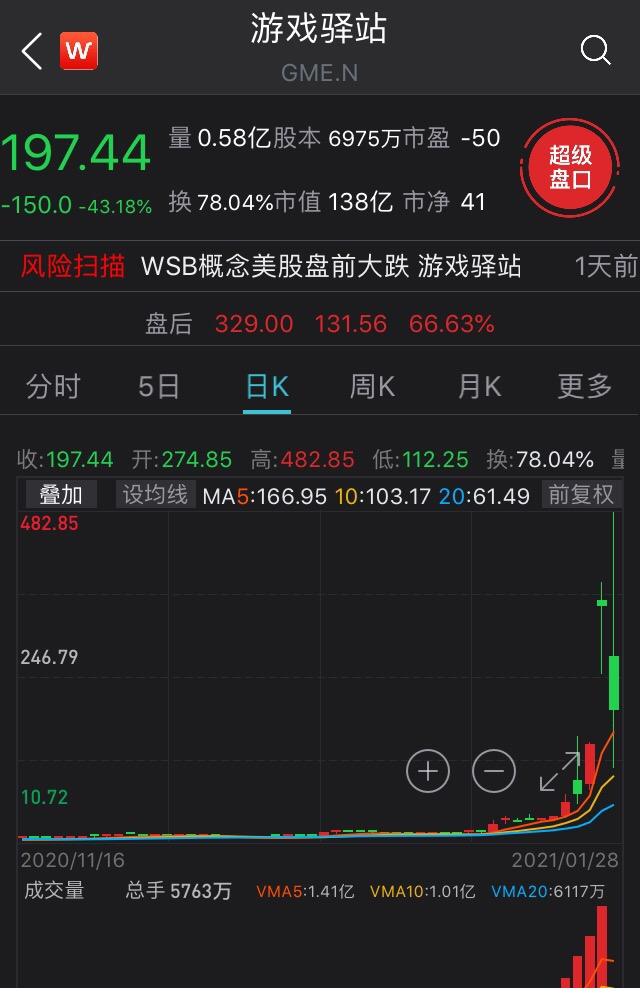 游戏驿站盘前一度触及近500美元的历史新高,但开盘后,WSB概念股们纷纷大跌。盘中游戏驿站至少触发了8次熔断。
