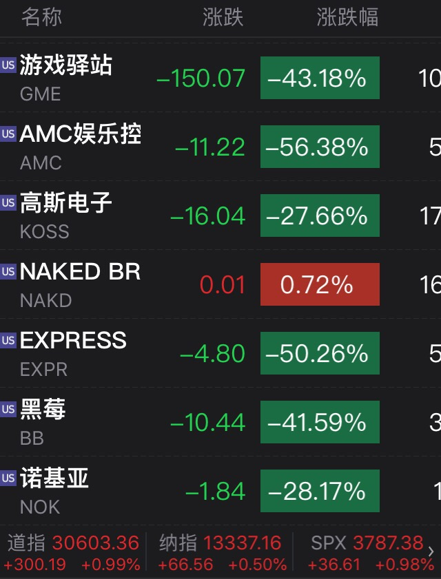 截至收盘,WSB概念股中AMC院线下跌56.38%、Express跌50.26%、游戏驿站跌43.18%、黑莓跌41.59%、诺基亚跌28.17%。