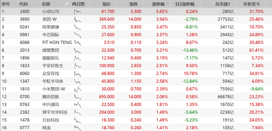 恒生科技指数成份全线回暖。其中,心动公司涨近6%,美团涨近4%,阿里健康、中芯国际、微盟涨超3%,小米、腾讯涨超2%。