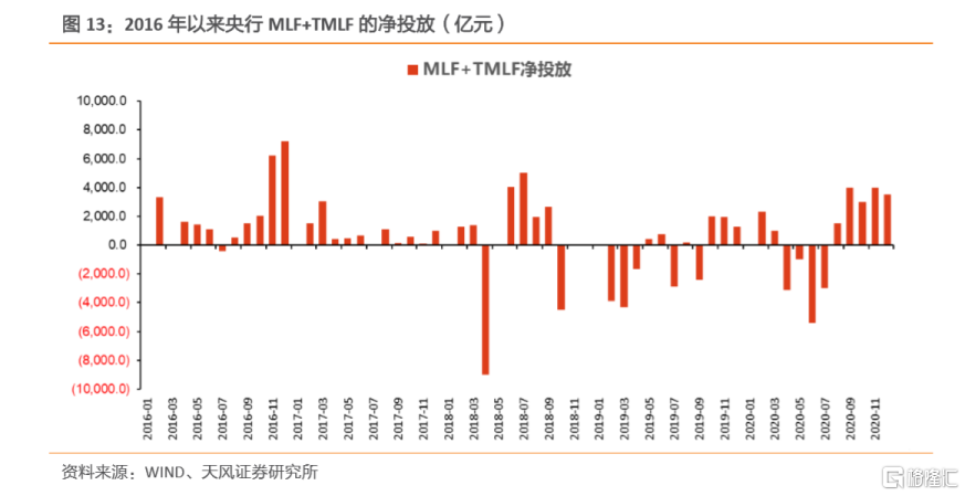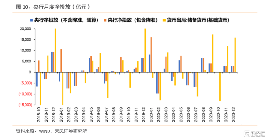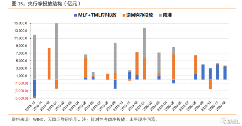 进一步,我们分别考虑逆回购、MLF与TMLF、降准三类近年来央行较常运用的货币政策工具的投放或净投放情况。