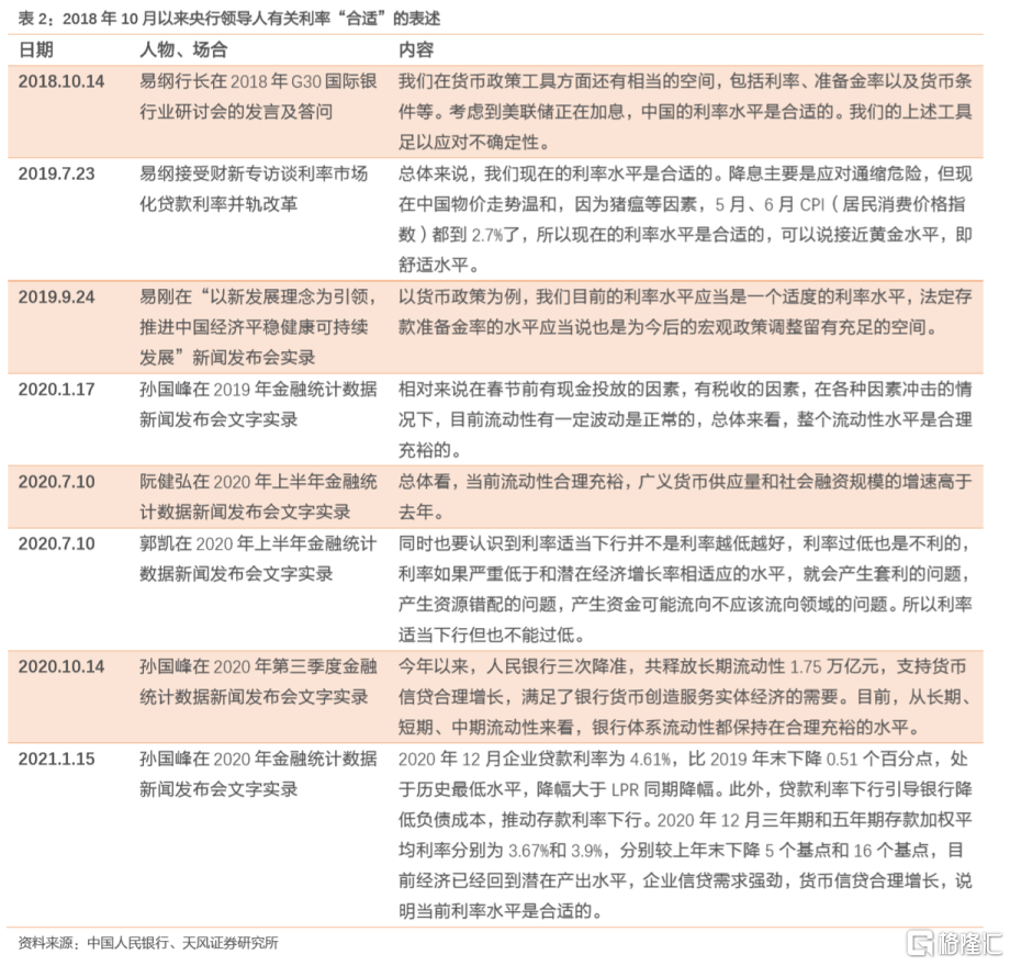 其实回顾过往央行主要领导人发言,从2018年10月以来,除2020年上半年受疫情冲击的特殊时点外,央行主要领导人在多个场合反复提到“流动性合理充裕”及“资金利率水平是合适的”等类似表述,而且易行长在2019年还强调过当前利率水平接近黄金水平,即舒适水平。