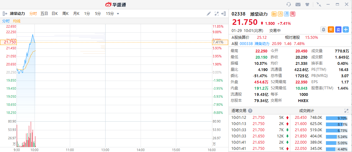 华盛资讯1月29日消息,港股潍柴动力早盘迅速拉升逾7%,A股亦涨幅强势。截至发稿,潍柴动力涨7.41%,现报21.75港元,成交额达1.645亿,当前总市值为1725亿港元。