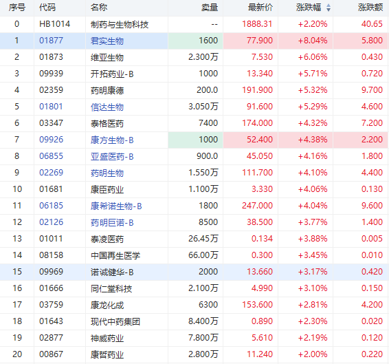 华盛资讯1月29日消息,生物制药板块今日迎来反弹,成分股普遍止跌。截至发稿,君实生物涨超8%,药明康德、信达生物涨超5%,泰格医药、康方生物、药明生物、康希诺生物涨超4%,药明巨诺涨超3%。