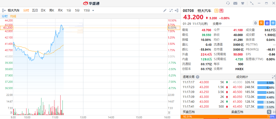 华盛资讯1月29日消息,恒大汽车盘中股价持续上扬,一度涨超8%。截至发稿,恒大汽车涨8.00%,现报43.2港元每股,当前成交额达1.58亿港元,总市值为3808亿港元。
