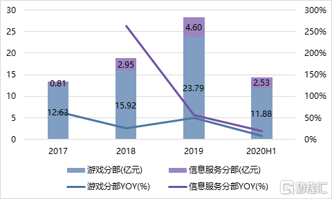 游戏业务为心动公司的主要营收来源,2020上半年,公司游戏业务营收11.9亿元,营收占比82.4%;另一部分的营收来源于信息服务,主要是TapTap的广告收入等,2020上半年营收2.5亿,营收占比17.6%。