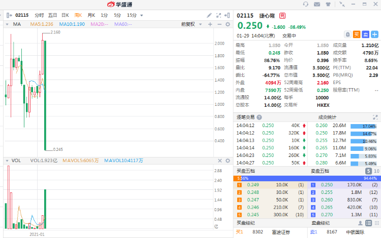 智通财经APP获悉,捷心隆(02115)午后惨遭洗仓,股价暴跌逾86%,低见2.45港元,创上市新低。截至发稿,跌86.49%,报0.25港元,成交额4673万港元。