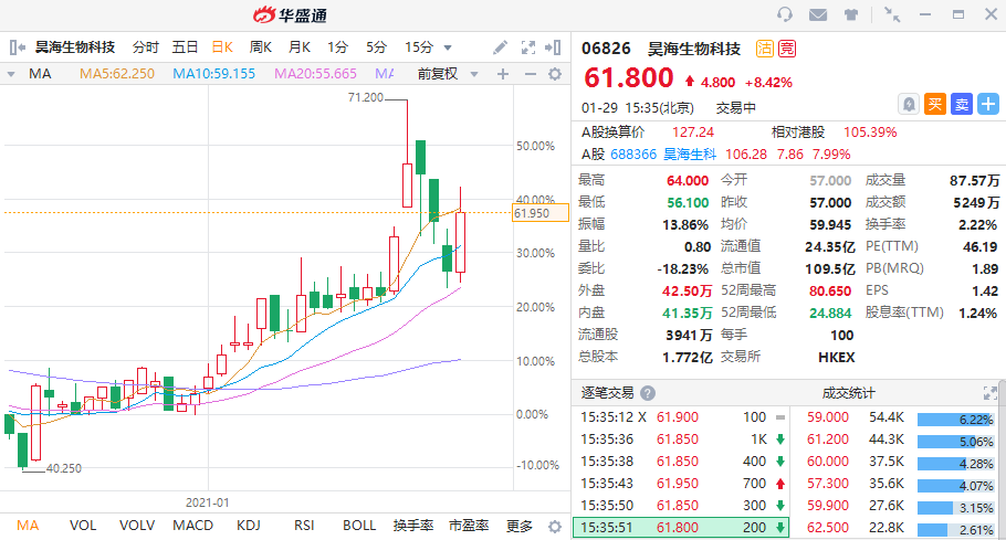 华盛资讯1月29日消息,昊海生物科技终止三连阴,午后一度拉升逾10%。截至发稿,昊海生物科技涨8.42%,现报61.8港元,成交额达5249万港元,当前总市值为109.5亿港元。