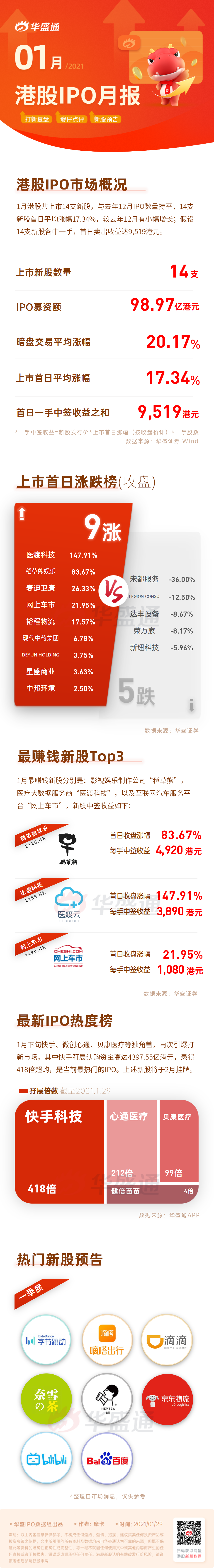 2021年1月,港股市场共迎来14支新股上市,暗盘交易平均涨幅达20%,上市首日均涨幅达17%。14支新股各中一手首日卖出可赚9519港元。