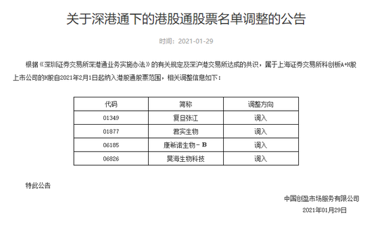 深交所发布公告,复旦张江、君实生物、康希诺生物-B和昊海生物科技H股自2021年2月1日起纳入港股通股票范围。