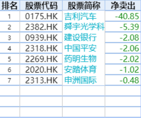 本周,南下资金抛售吉利汽车40.85亿港元,位列抛售额第一。此外,南下资金抛售舜宇光学科技5.39亿港元,位列抛售额第二。此外,建设银行、中国平安、建设银行、药明生物、安踏体育等个股也遭到内资抛售。