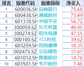 此外,北上资金净买入通威股份73.49亿元,净买入中国平安56.72亿元,净买入东方财富49.95亿元。阳光电源、TCL科技、药明康德、立讯精密等个股也获得港资加仓。