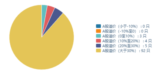 本周共有92只A股溢价超过30%,有5只A股溢价在20%-30%之间,有4只A股溢价在10%-20%之间,有3只A股溢价在10%以内。