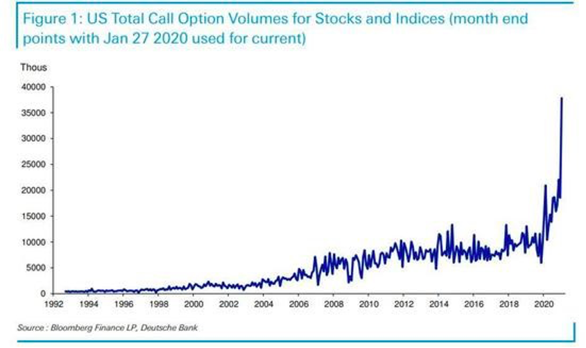 美国所有股票和指数的看涨期权总量猛增。德意志银行分析师Jim Reid表示:“历史上许多泡沫都是通过杠杆交易的增加而产生的,这种模式无疑正在这里重演。”