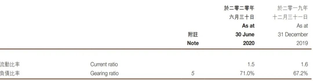 负债比率(期末负债净额(计息银行及其他借款总额,不包括应付利息,并扣除现金及银行结余)除以资产净值)也超过70%,达到71.0%……