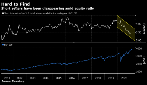这是Maneesh Deshpande牵头的巴克莱策略师的观点。通过计算空头押注与整个市场市值的关系,他们发现过去一年的卖空头寸已下降到至少自2008年以来的最低水平。此外,今年被日内交易员锁定的做空量最大企业的空头头寸还不到总规模43万亿美元市场的0.001%。