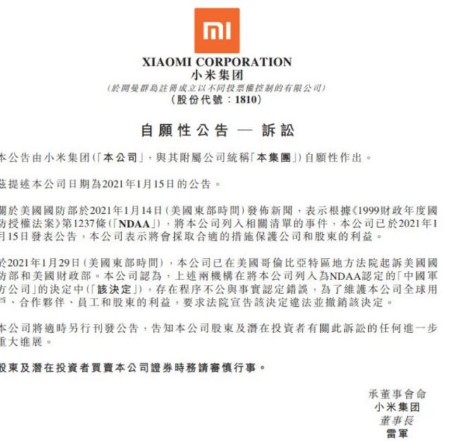 小米集团发公告称,公司于美国东部时间1月29日在美国哥伦比亚特区地方法院起诉美国国防部和美国财政部。