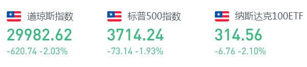 美股上周五大幅收跌,道指跌620.74点,或2.03%,报29982.62点;纳指跌266.46点,或2.00%,报13070.69点;标普500指数跌73.14点,或1.93%,报3714.24点。