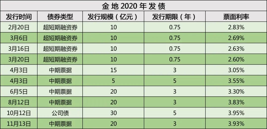 据观点地产新媒体不完全统计,2020年,金地共计发行10次包含超短期融资债券、中期票据、公司债等,合共150亿元规模的债券,利率均低于4%。