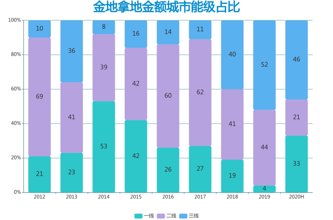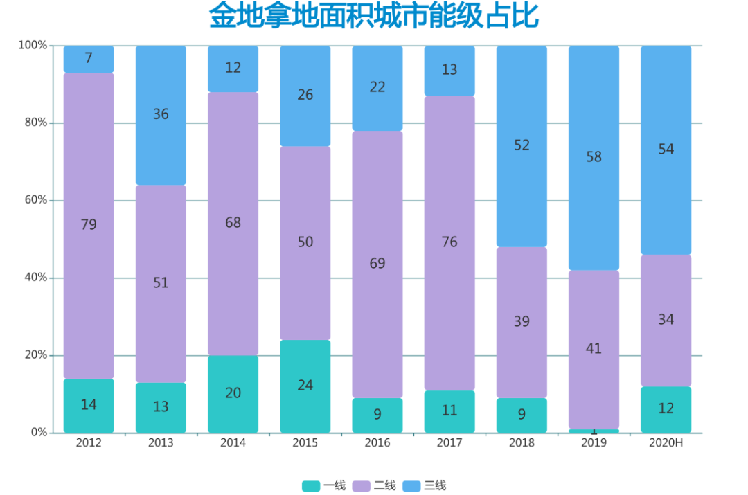 拿地金额占比亦是如此,2018年到2020年半年度,金地三线城市布局金额明显提高,分别达到40%、52%、46%。